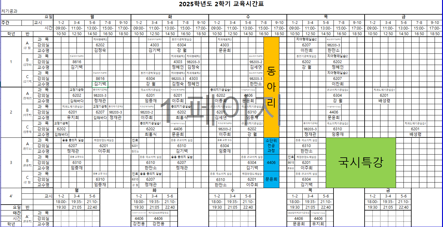 View 2025학년도 2학기 교육시간표 작성자 치기공학과 조교 작성일 25/08/26 (14:31) 조회수 709 2025학년도 2학기 교육시간표 입니다. 25-2_교육시간표_최종.PNG (109.3 KB) 목록으로