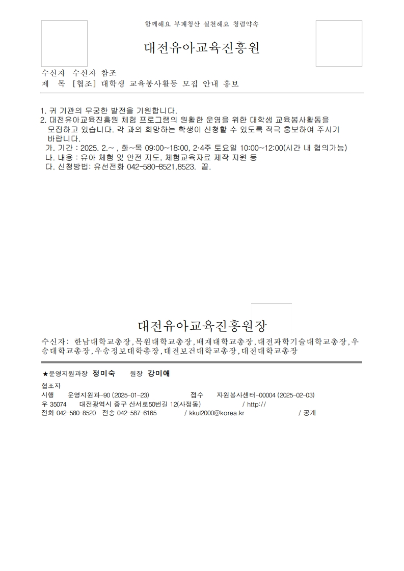 | 대전유아교육진흥원 대학생 교육봉사활동 모집 안내 | ||