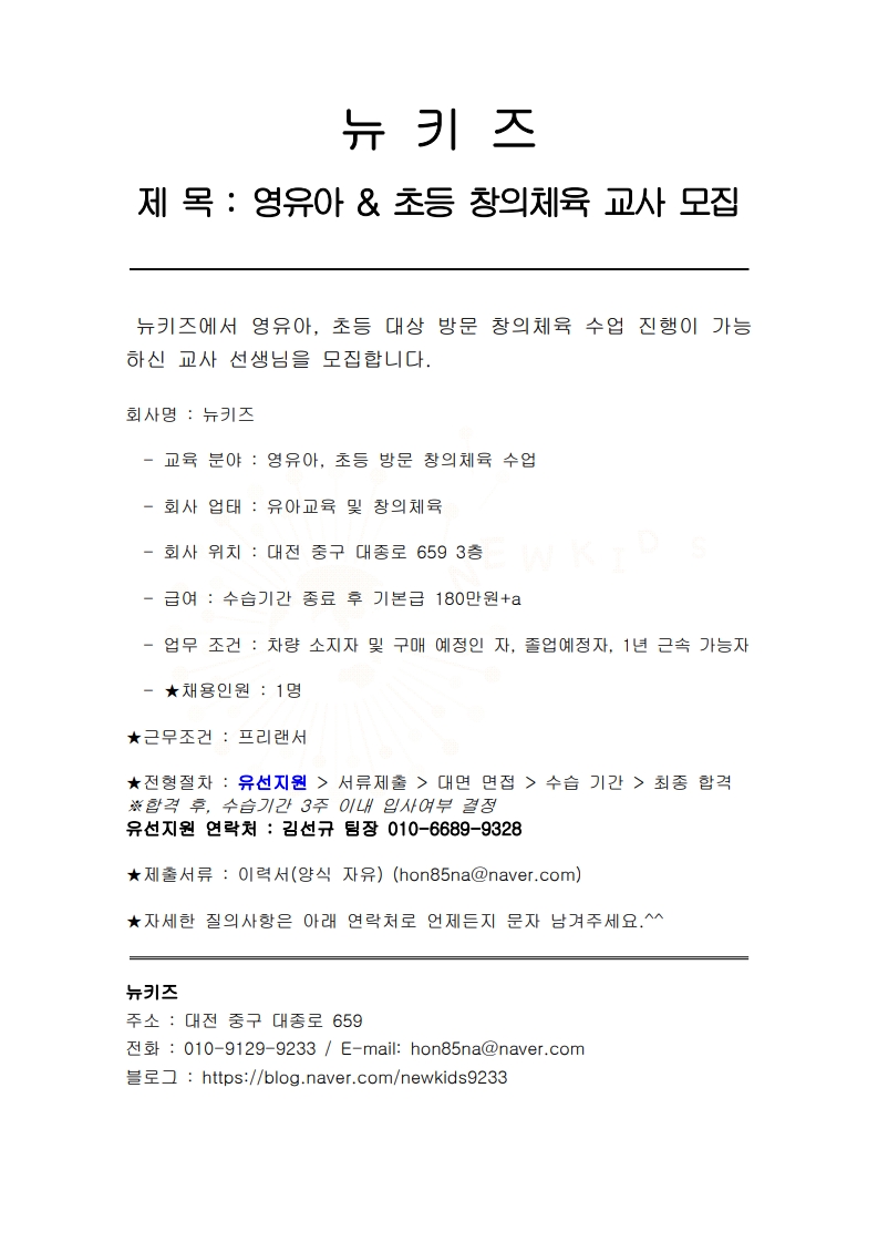 | [뉴키즈 유아체육] 교사 모집 안내 | ||