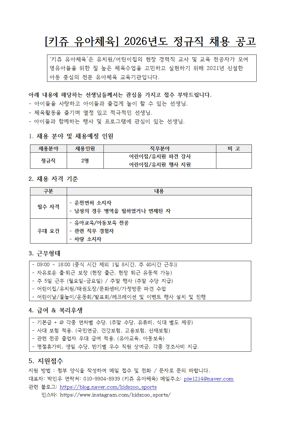 키쥬 유아체육에서 2026년도 정규직 교사를 모집합니다.