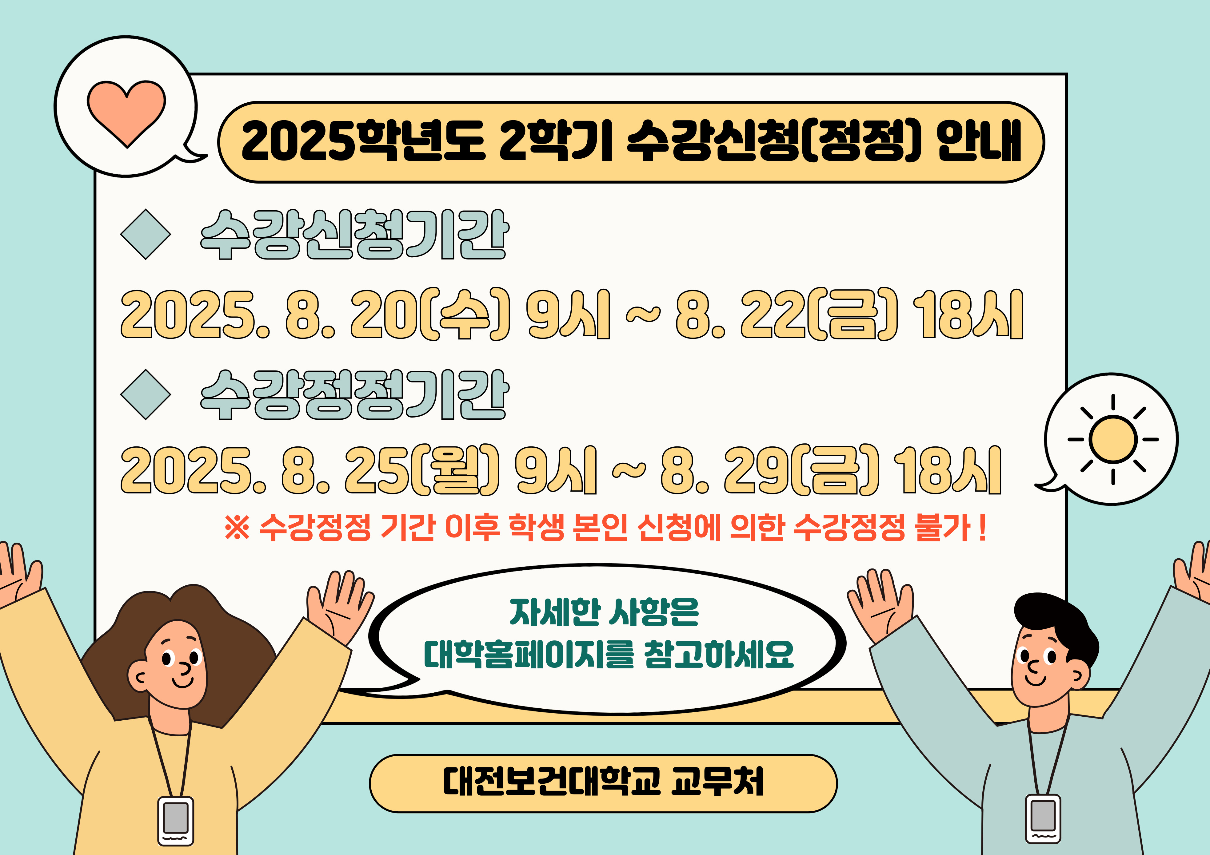 View 2025학년도 2학기 수강신청 및 정정기간 안내 작성자 담당자 작성일 25/08/18 (12:31) 조회수 322 학사공지 | HIT 대전보건대학교 (※ 수강신청에 관한 자세한 내용은 여기 클릭) 2025-2_수강신청_안내문(게시판_부착용).jpg (1.2 MB) 목록으로