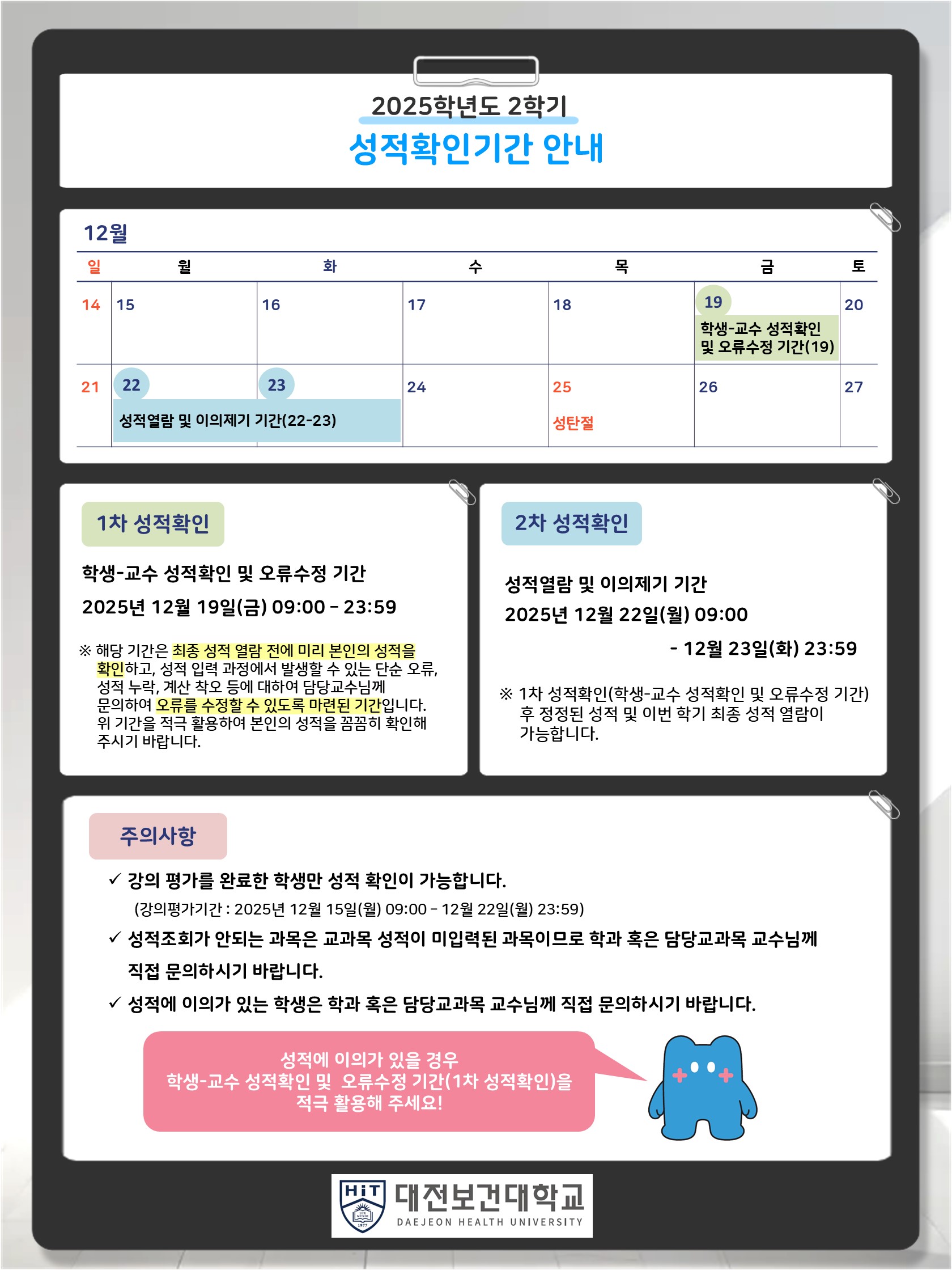 View ⭐ 2025학년도 2학기 성적확인기간(학생) 안내 ⭐ 작성자 담당자 작성일 25/11/20 (11:20) 조회수 111 - 공지사항 입니다. 2025-2학기_성적확인기간_안내(세로).jpg (465.4 KB) 목록으로