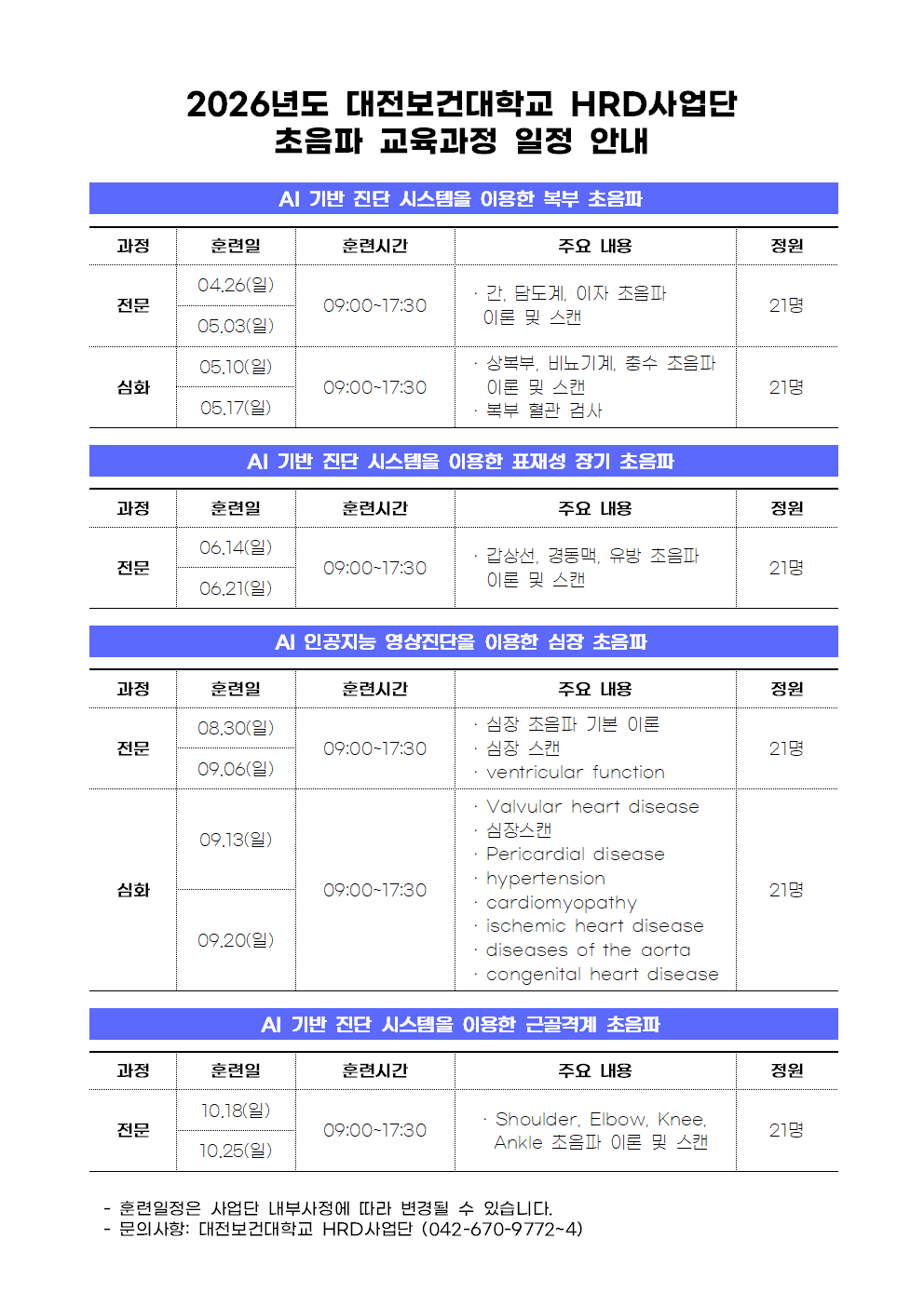 View [안내] 2026년 초음파 교육과정 일정 안내(정부지원) 작성자 HRD사업단 작성일 26/04/01 (14:14) 조회수 97 - 공지사항 입니다. 2026년_HRD_초음파_과정_일정표_공지용.png (97.2 KB) 목록으로