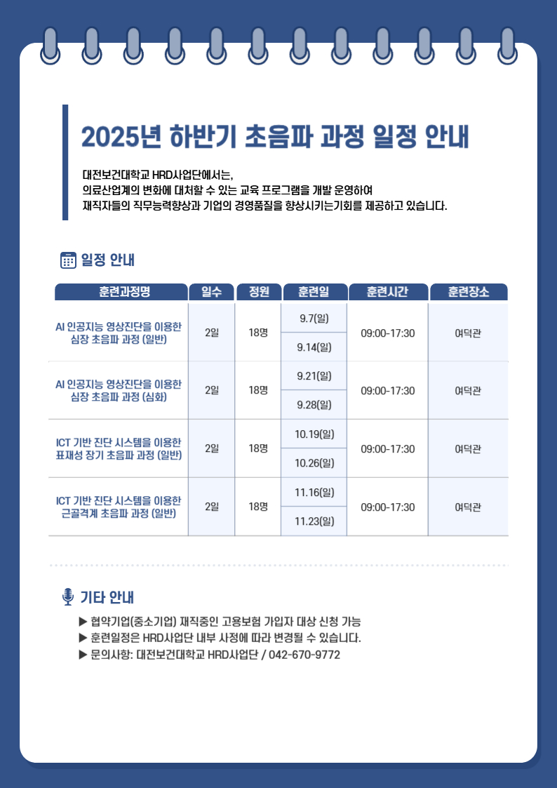 View [안내] 2025년 하반기 초음파 과정 일정 안내(정부지원) 작성자 HRD사업단 작성일 25/07/28 (11:48) 조회수 6049 2025년_하반기_초음파_과정_일정_안내.jpg (297.0 KB) 목록으로