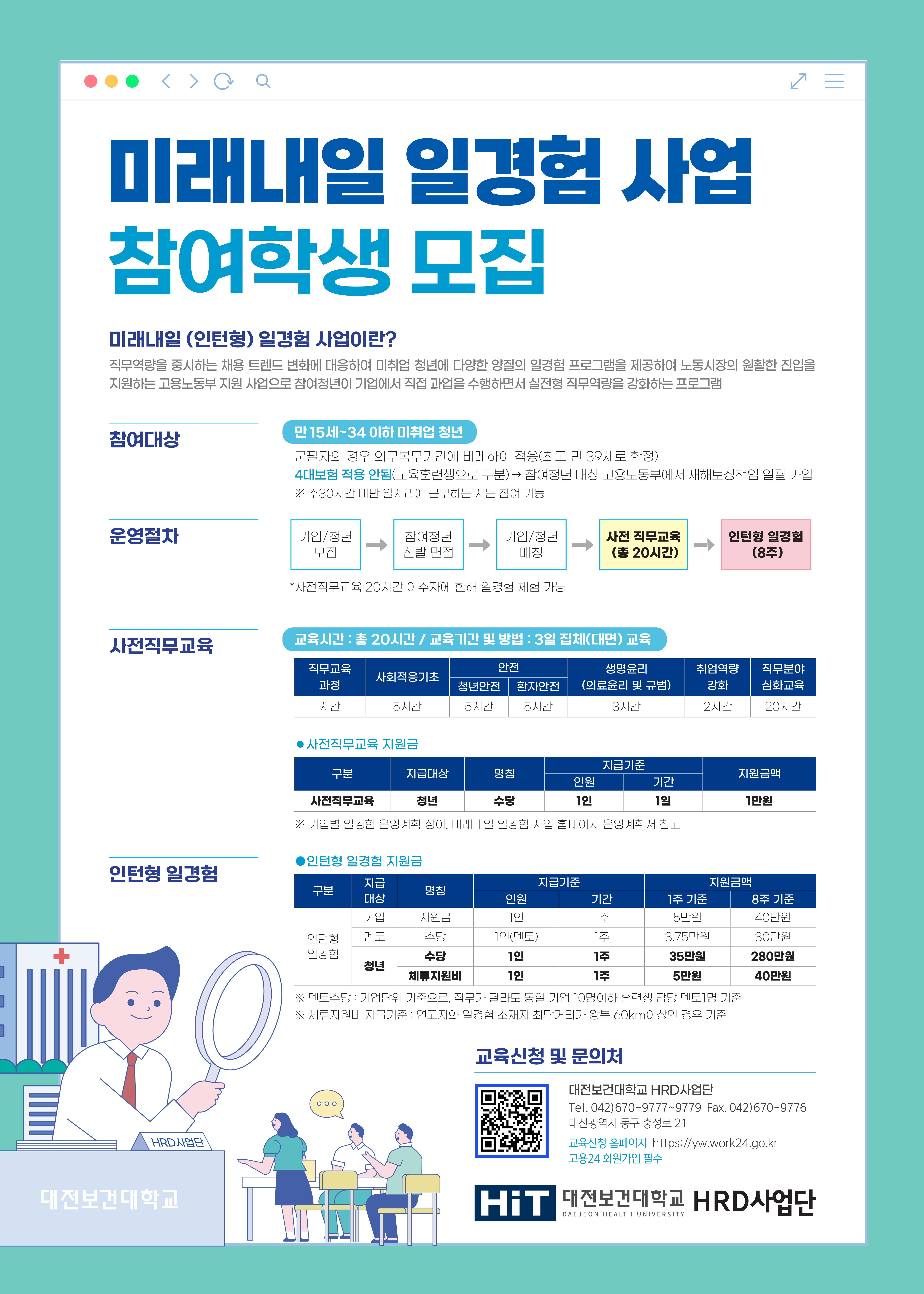View [모집] 미래내일 일경험 사업 참여학생 모집 작성자 HRD사업단 작성일 25/04/30 (00:00) 조회수 111 2025년_미래내일_포스터.pdf (172.2 KB)2025년_미래내일_포스터_page-0001.jpg (4.2 MB) 목록으로