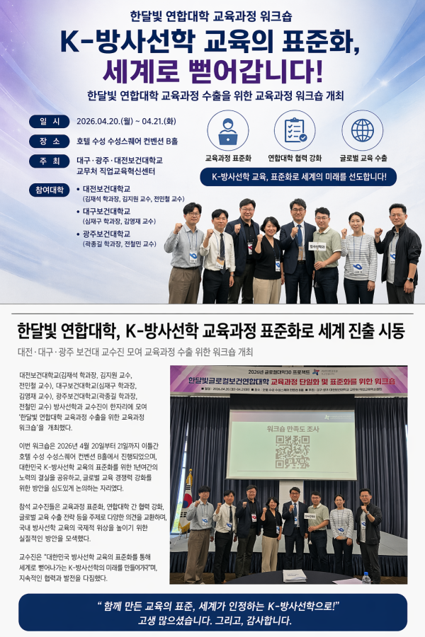 광주 라마다호텔 — 2025년 8월 11~12일 열린 ‘한달빛 연합대학 교육과정 단일화 워크숍’에서 대전보건대·광주보건대·대구보건대 방사선학과 대표 교수진이 교육과정 단일화에 합의했다. 이번 합의에는 모듈·트랙제 도입, 일타강사 제도 운영, 전체 교과목의 약 80% 일치 목표 등 핵심 안이 포함됐다.
