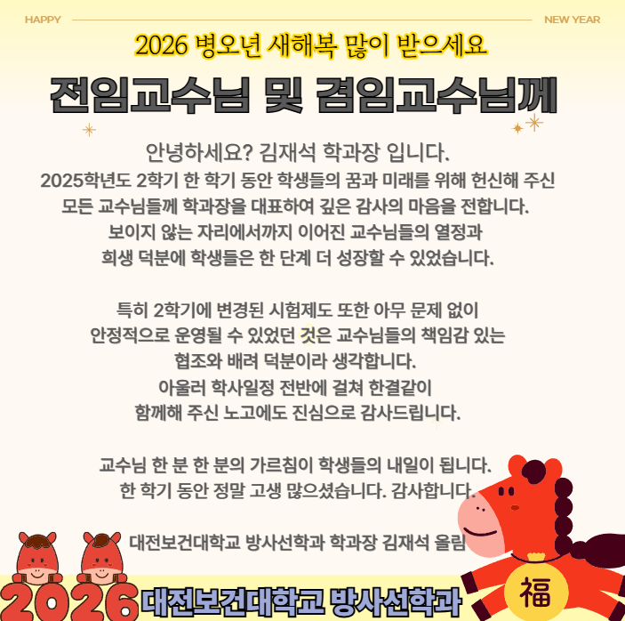 View 전임교원 겸임교원께 감사의 글 작성자 김재석 작성일 25/12/20 (12:46) 조회수 2987 - 공지사항 입니다. 전임교원 겸임교원 감사의 글 KakaoTalk_20251219_181915829.png (143.0 KB) 다음글 국시응원의 글 이전글 제53회 방사선사 국가고시 합격 기원 응원 행사 진행 목록으로