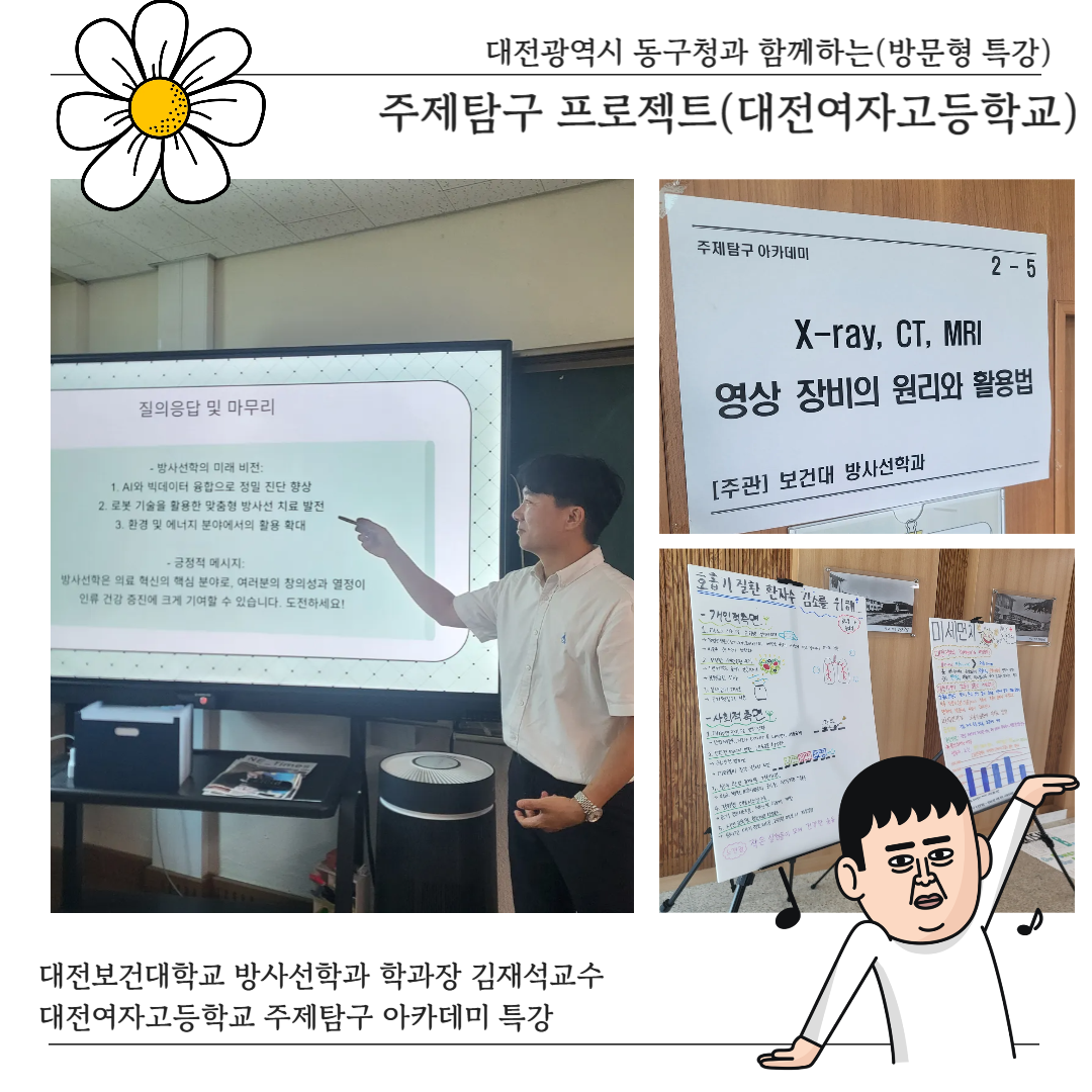대전보건대학교 방사선학과 김재석 학과장은 2025년 7월 8일, 대전여자고등학교에서 열린 ‘주제탐구 아카데미 프로젝트’에 초청되어 고등학생들을 대상으로 의료영상기기 특강을 진행했다.