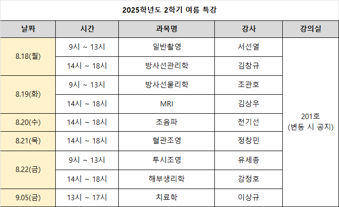 2025학년도 2학기 여름방학 중 방사선사 국가시험 대비 특강 일정을 아래와 같이 안내드립니다.