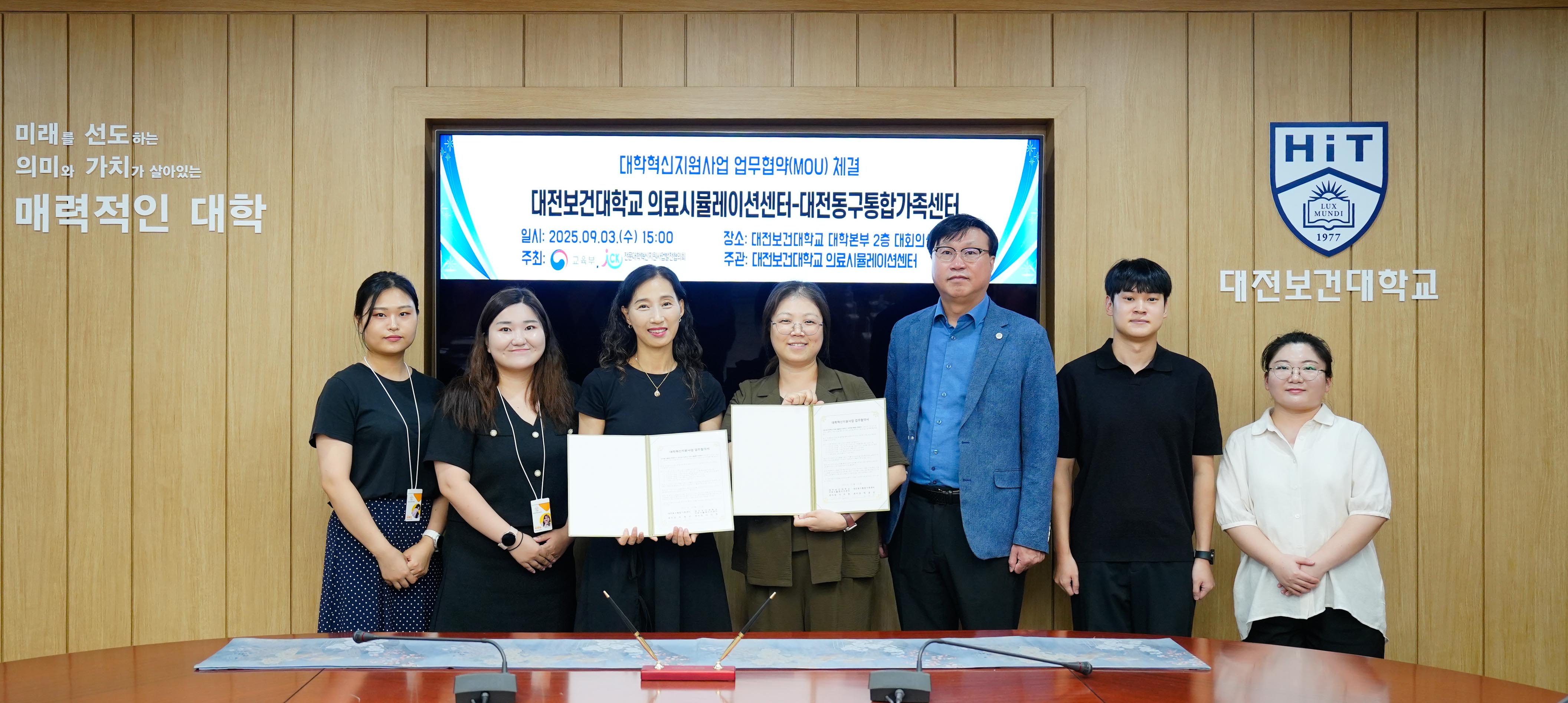 대전보건대학교(총장 이정화) 대학혁신지원사업단 의료시뮬레이션센터는 지난 9월 3일(수), 본교 대학본부 2층 대회의실에서 대전동구통합가족센터와 지역사회 다문화 가족의 건강 증진과 복지 향상을 위한 업무협약(MOU)을 체결하였다.