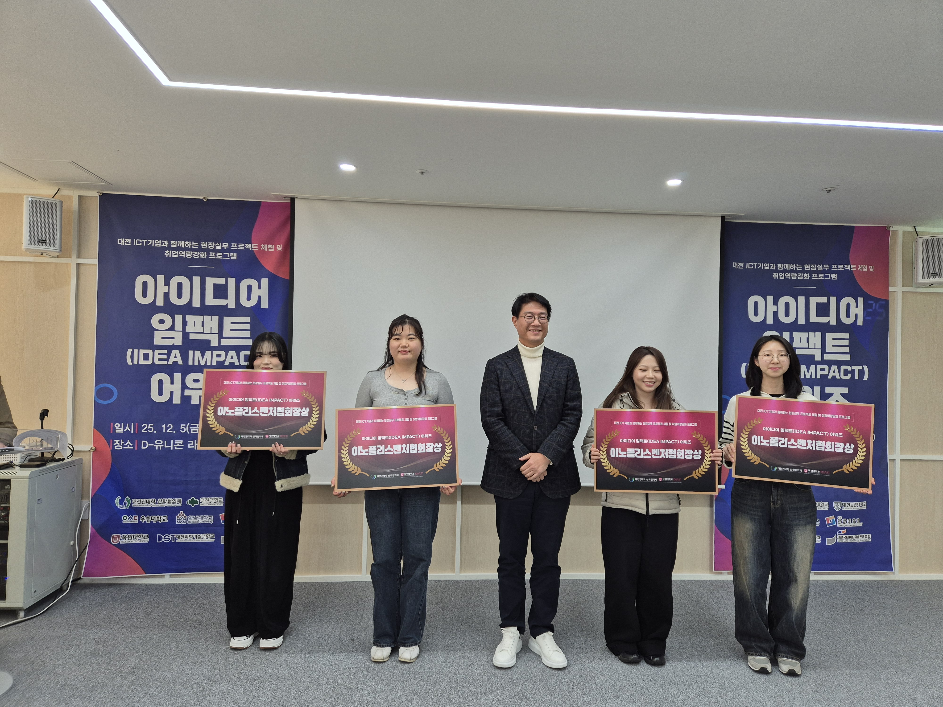 대전보건대학교(총장 이정화) condition nienzo팀(전소정 외 2명)이 대전권 7개 대학이 참여한 「대전 ICT기업과 함께하는 현장실무 프로젝트 체험 및 취업역량강화 프로그램」의 최종 발표회인 '아이디어 임팩트 어워즈(IDEA IMPACT Awards)'에서 '이노폴리스벤처협회장상'을 수상했다.