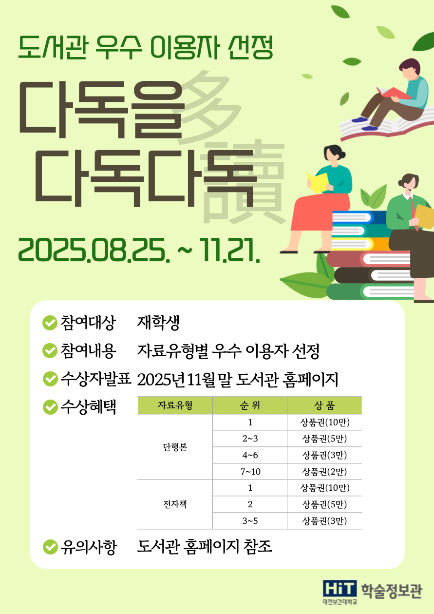 「2025년 2학기 다독자」를 아래와 같이 선정하오니 독서의 즐거움도 만끽하고! 상품도 받아가세요!