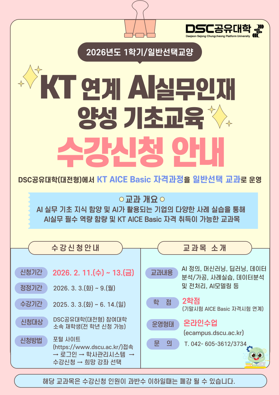 1. 교과목명: KT연계 AI실무인재 양성 기초교육(일반선택 교양교과)