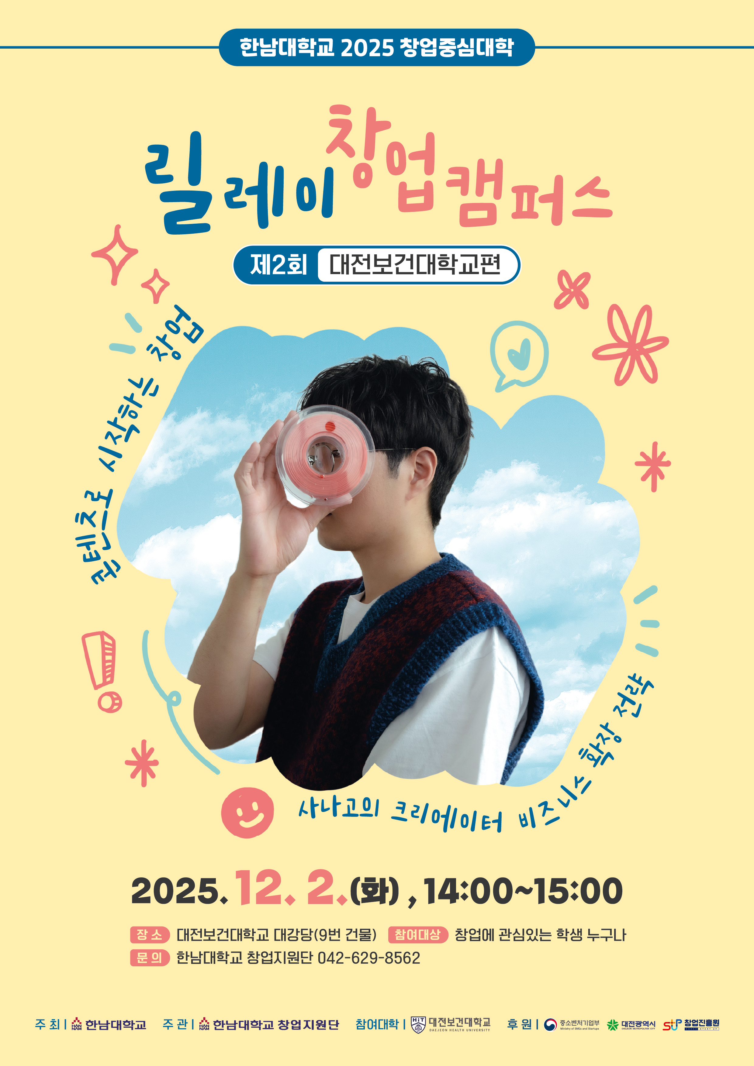 아래와 같이 한남대학교에서 주관하는 "2025년 창업중심대학 릴레이 창업 캠퍼스 - 제2회 창업특강" 참여자를 모집하오니,