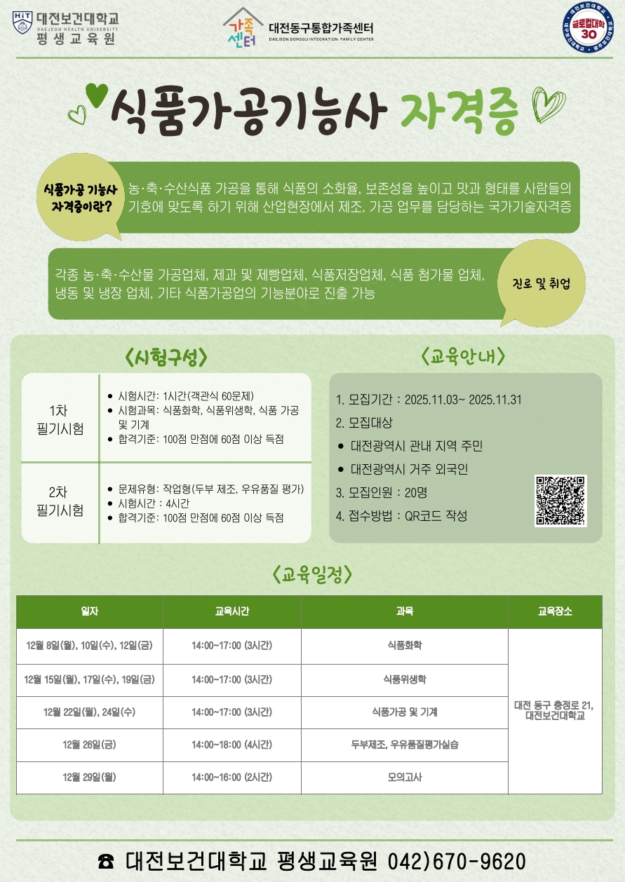 농-축-수산식품 가공을 통해 식품의 소화율, 보존성을 높이고 맛과 형태를 사람들의 기호에 맞도록 하기 위해 산업현장에서 제조-가공 업무를 담당하는 국가기술자격증인 식품가공기능사 자격증 과정을 진행하고자 하오니, 진행을 원하시는 분들은 하단의 QR코드 신청서를 작성해주시길 바랍니다.