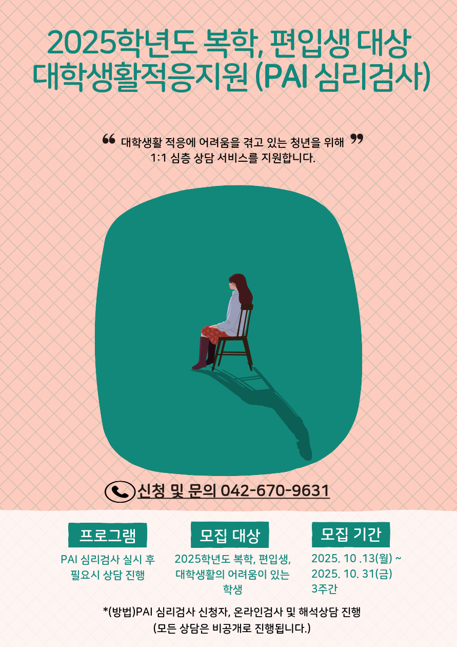 | [학생상담실] 2025학년도 복학, 편입생 대상 대학생활적응지원 심리검사(PAI성격평가질문지) 실시 안내 | ||
