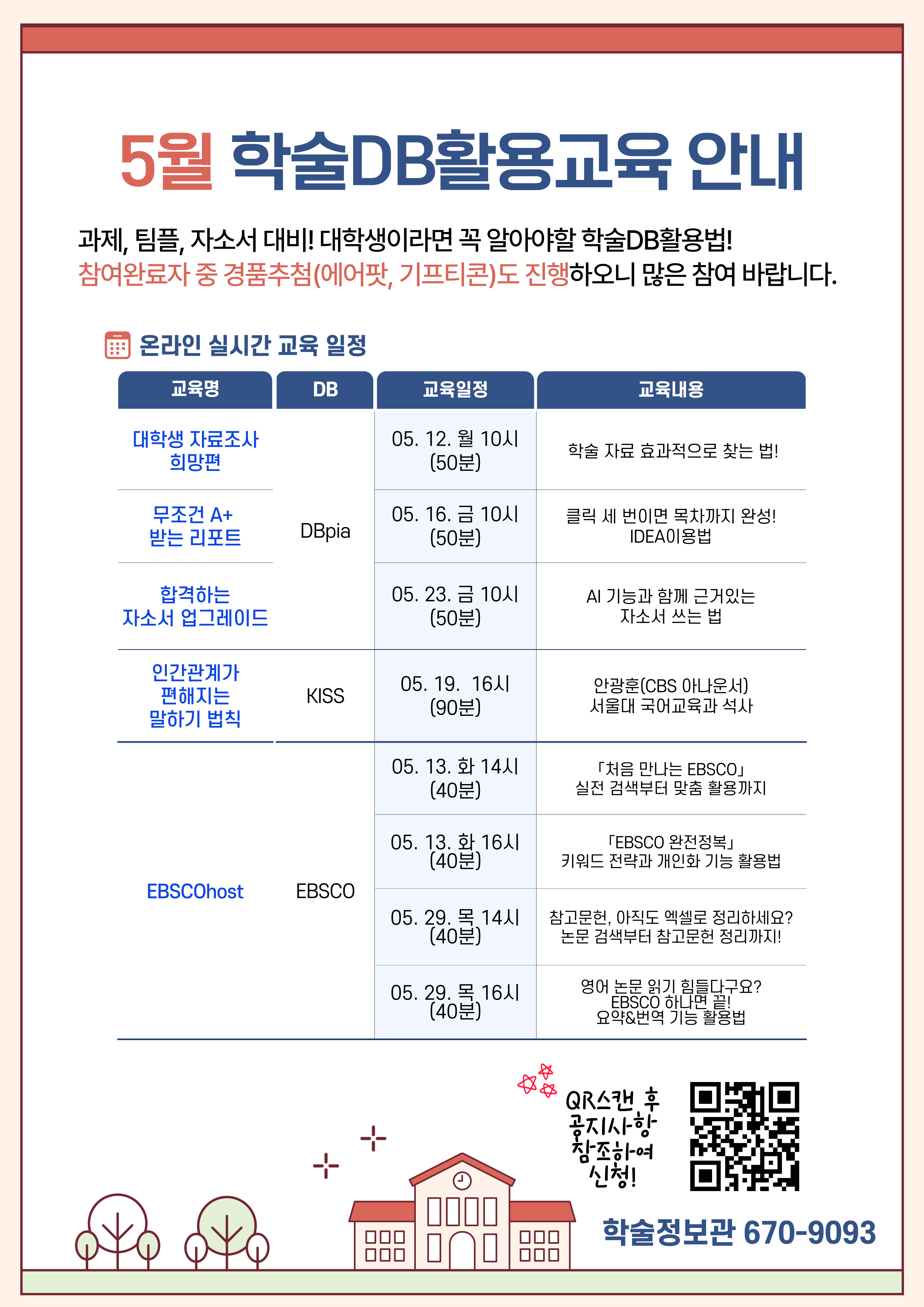 학술 AI 기능을 활용한 과제, 팀플, 자소서 작성법 등 학술DB 활용 교육을 아래와 같이 진행합니다.