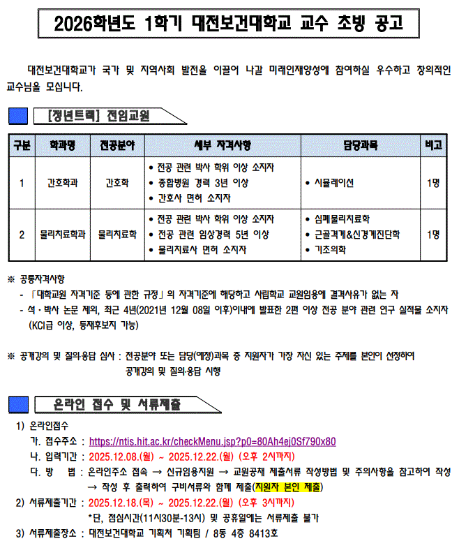 | 2026학년도 1학기 대전보건대학교 교수 초빙 공고 | ||