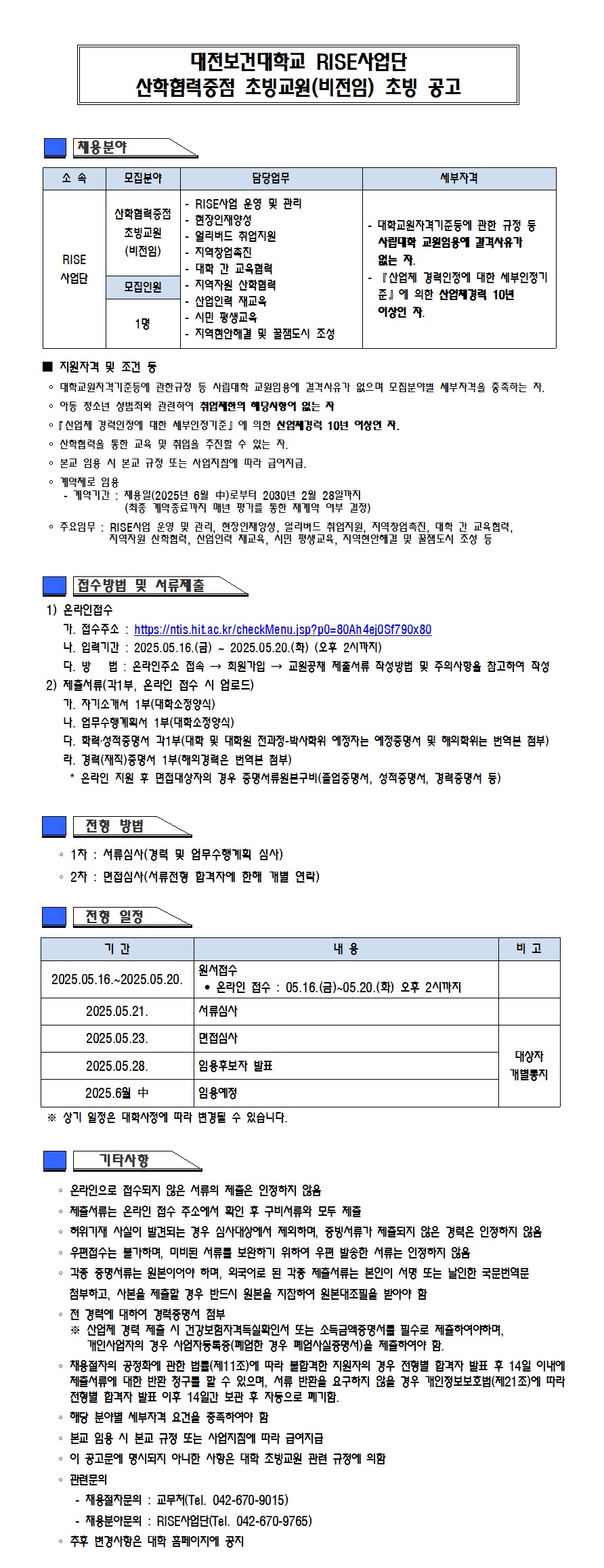 | 대전보건대학교 RISE사업단 산학협력중점 초빙교원(비전임) 초빙 공고 | ||