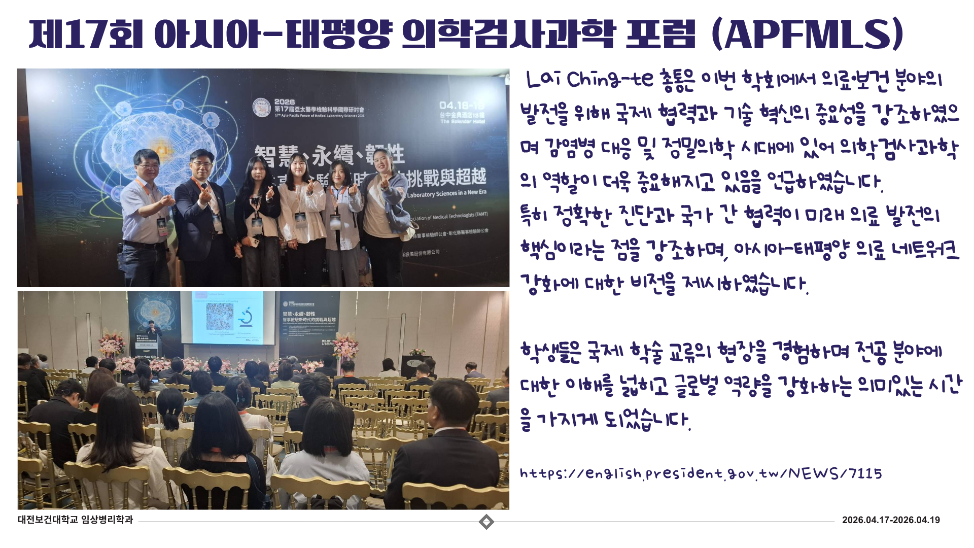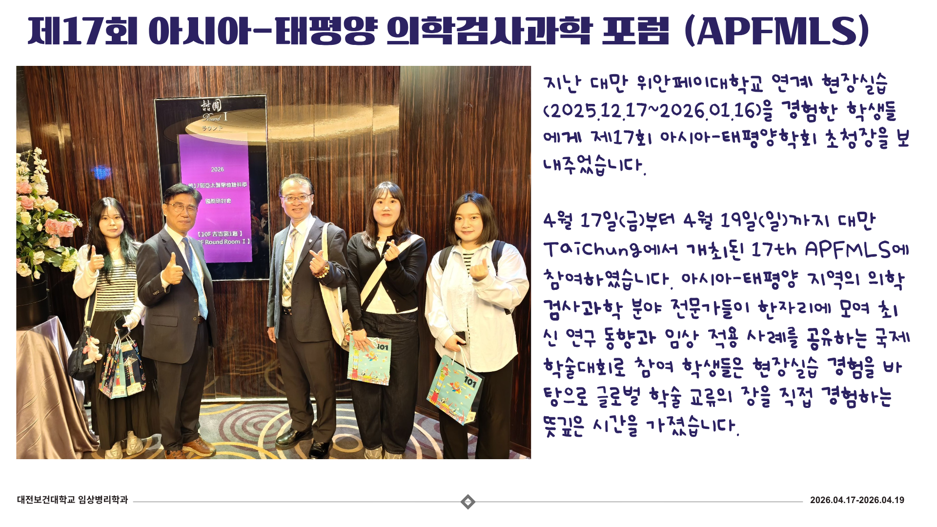 View 제 17회 아시아-태평양 학회(APFMLS) 다녀왔습니다! 작성자 담당자 작성일 26/04/21 (19:19) 조회수 52 1.png (356.1 KB)2.png (2.3 MB)3.png (1.7 MB)4.png (2.3 MB) 목록으로