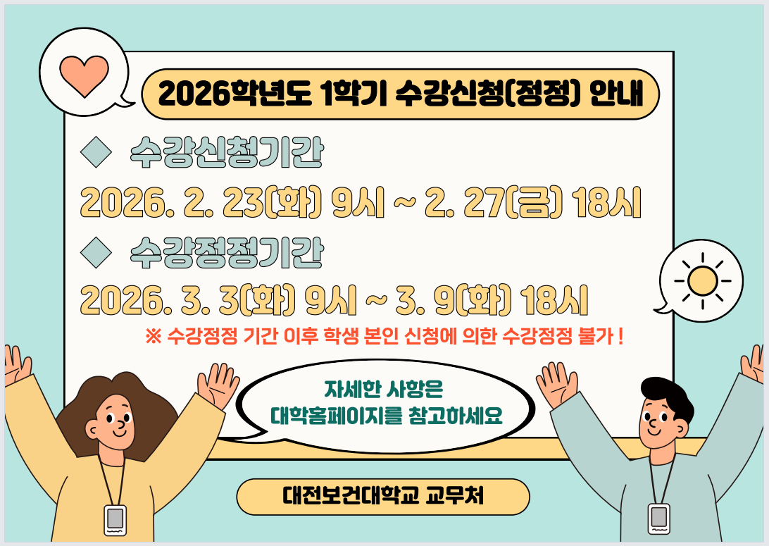 View 2026학년도 1학기 수강신청 및 정정기간 안내 작성자 담당자 작성일 26/02/20 (11:52) 조회수 59 - 공지사항 입니다. 2026-1_수강신청_안내문.PNG (176.8 KB) 목록으로