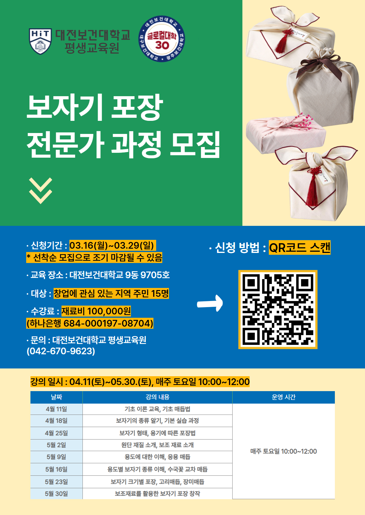 해당 과정 참여와 관련하여 문의사항은 대전보건대학교 평생교육원(042-670-9623)으로 연락주시기 바랍니다.