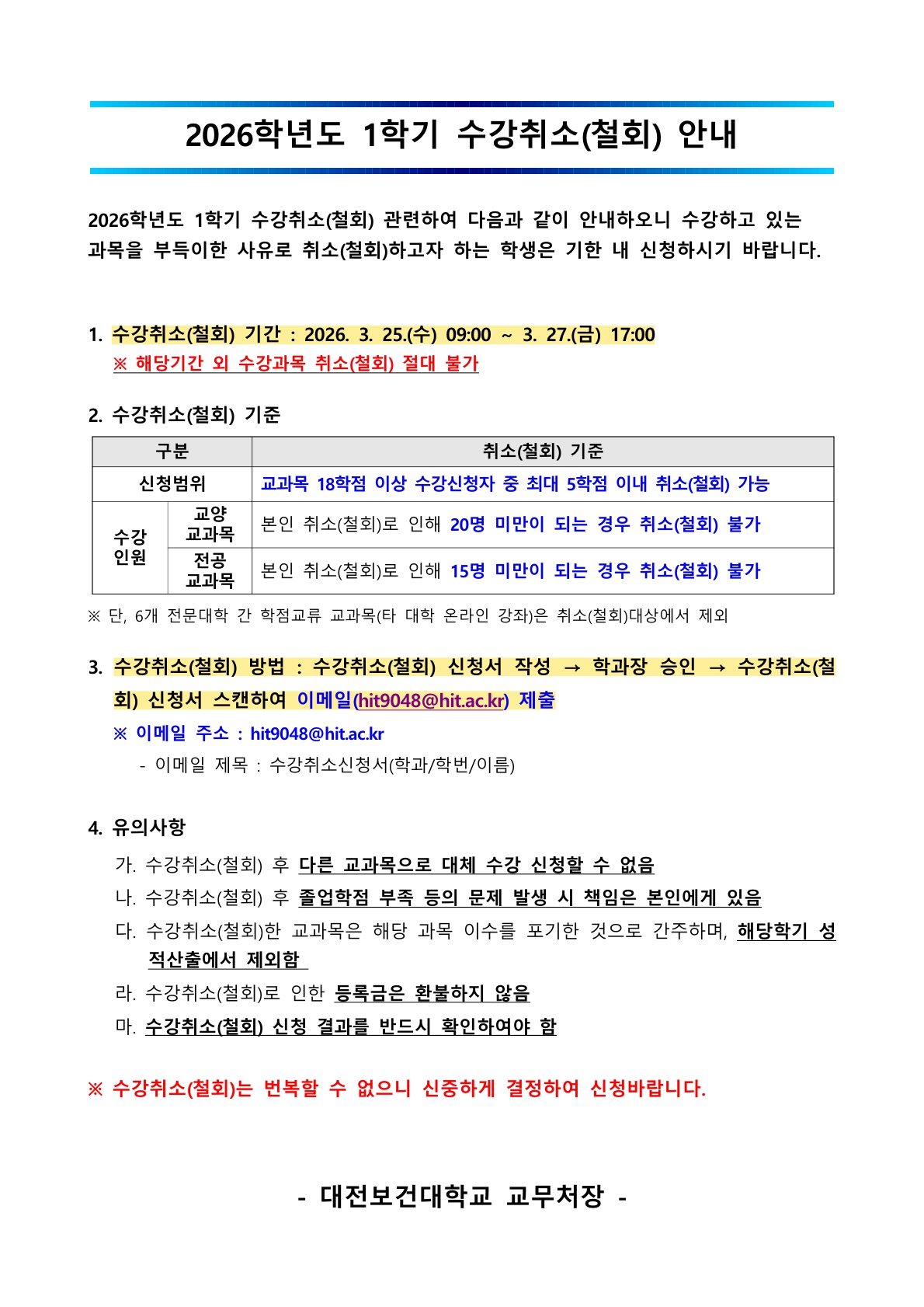 View 2026학년도 1학기 수강취소(철회) 안내 작성자 교무팀 작성일 26/03/16 (09:40) 조회수 202 1._2026학년도_1학기_수강취소(철회)_안내문_1.jpg (387.0 KB)2._수강취소(철회)_신청서(서식).hwp (45.0 KB) 목록으로 담당부서명 교무팀