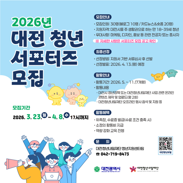 | (재)대전청년내일재단 「2026년 대전 청년 서포터즈」모집 | ||