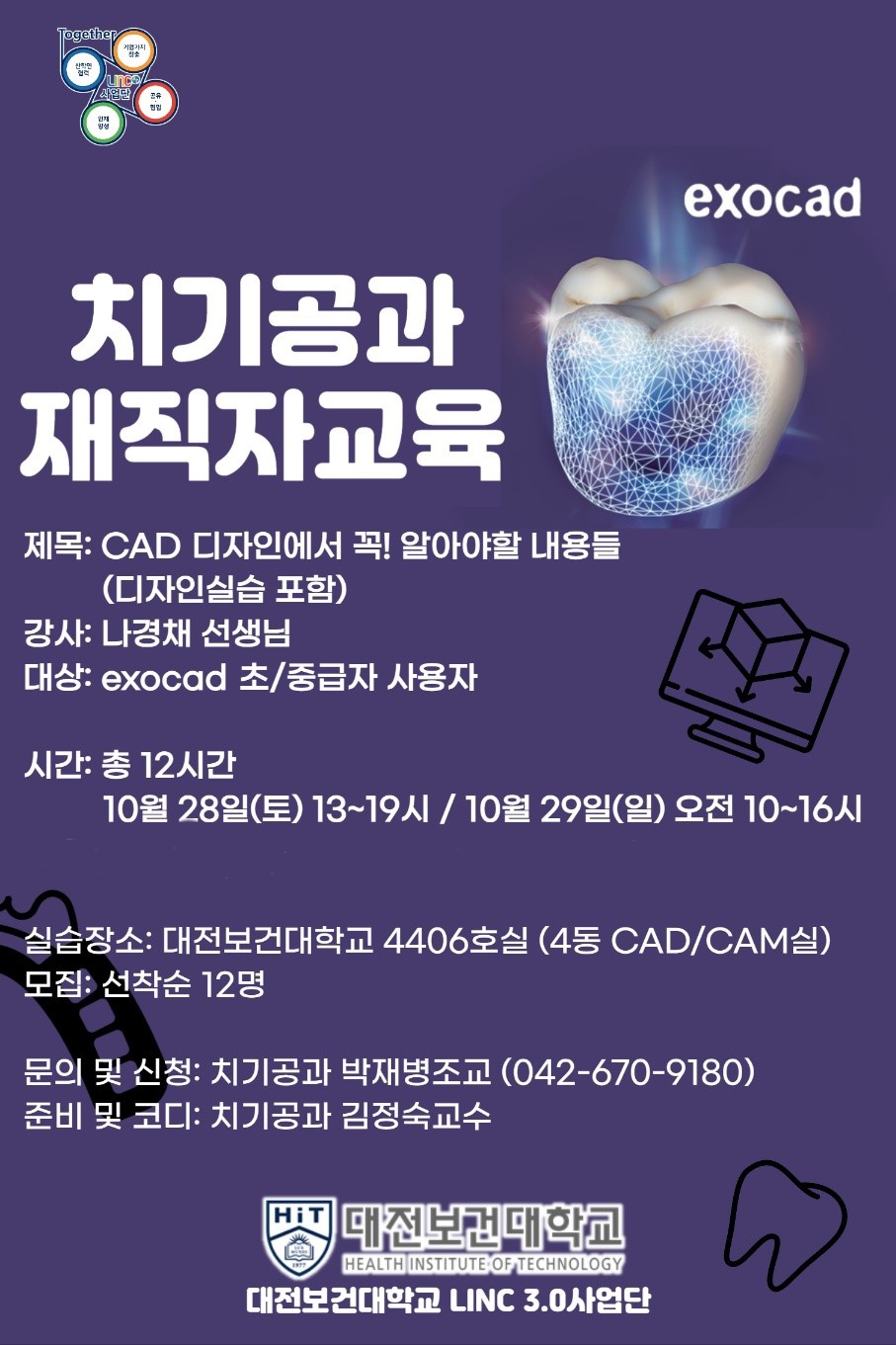 대전보건대학교 치기공과에서 재직자 교육을 실시할 예정이오니 많은 참여와 관심 부탁드립니다.