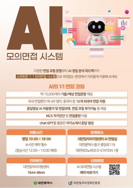 AI모의면접시스템을 활용하여 비대면 면접상황 체험을 통해 구직자들의 면접스킬 및 문제대처능력을 향상 할 습니다.
