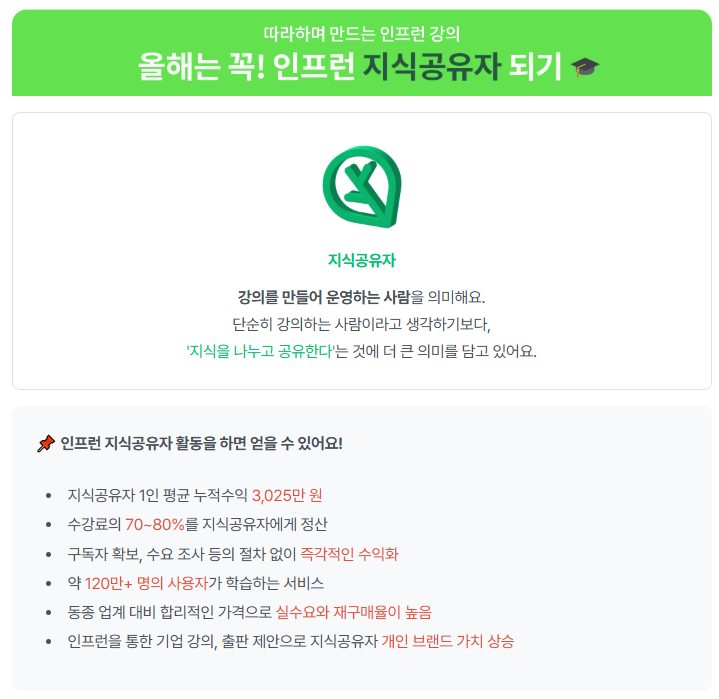 인프런 지식공유를 위한 강의 기획, 제작, 편집, 운영 노하우, 인프런 지식공유 활동이 갖는 의미를 배울 수 있는 무료 강의가 있어 안내드립니다.