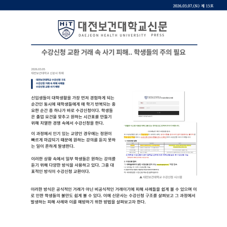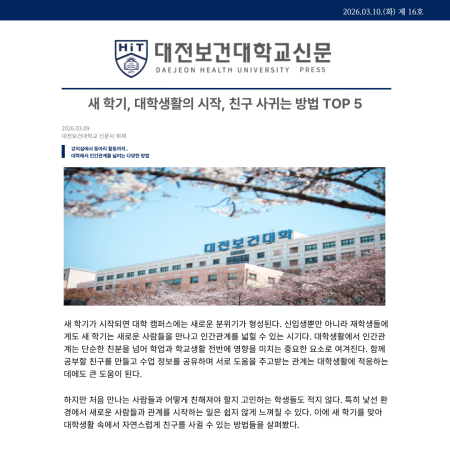 안녕하세요~ 대전보건대학교 대표 블로그입니다!! “아직 3월 멀었지~” 하다가 정신 차리니 이미 3월 3일 개강을 했네요.. 여러분 2026학년도 1학기, 대전보건대학교 캠퍼스가 다시 숨 쉬는 시간. 오늘은 대전보건대학교 2026학년도 1학기 학사일정을 그냥 알려주는 게 아니라, “이 시기에 학생들 상태가 어떤지”까지 솔직하게 알려드릴게요! 검색하러 왔다가 공감하고 가는 글, 시작합니다. 3월 – 설렘 20% 현실 80%의 시작 3월 3일 개강 3월 3일 ~ 9일 수강정정기간 개강 이후.. 신입생: “대학교 감성 시작이다” 재학생: “알람 소리 왜 이렇게 낯설어…” 그리고 진짜 전쟁은 여기서 시작됩니다. 수강정.......