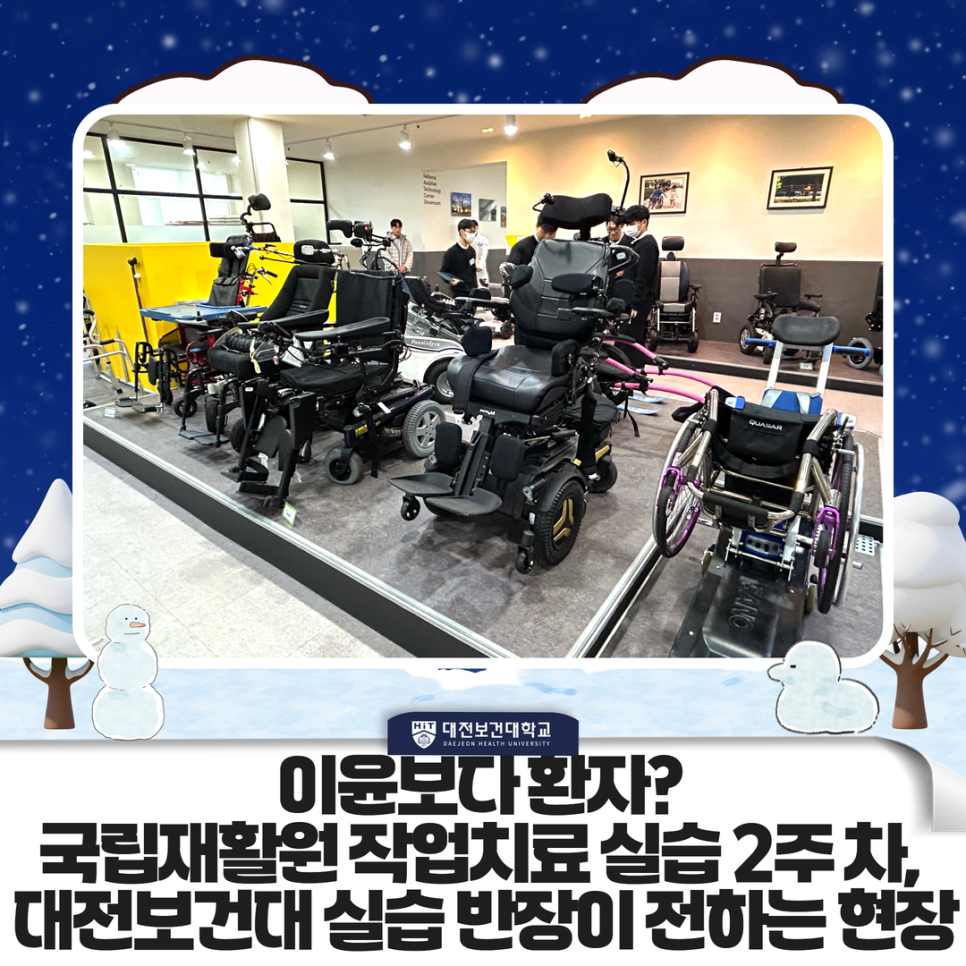안녕하세요~ 대전보건대학교 블로그 지기입니다! “실습이 다르면, 시야부터 달라진다” 작업치료학과 실습이라고 하면 대부분 “현장 경험”, “임상 적응” 같은 말부터 떠올리게 됩니다. 하지만 국립재활원에서의 작업치료 실습은 그 익숙한 단어들의 의미를 완전히 다시 쓰게 만듭니다. 대전보건대학교 작업치료학과 학과홍보대사 히스토리 3기, 임성수 학생은 현재 국립재활원에서 작업치료 실습 반장을 맡아 실습을 이어가고 있습니다. 어느덧 2주 차를 넘긴 지금, 그는 “국가기관만의 시스템이 왜 다르다고 말하는지 몸으로 느끼고 있다”고 전합니다. 이윤보다 ‘사람’을 먼저 보는 작업치료 국립재활원 실습에서 가장 크게 느껴지는 차.......