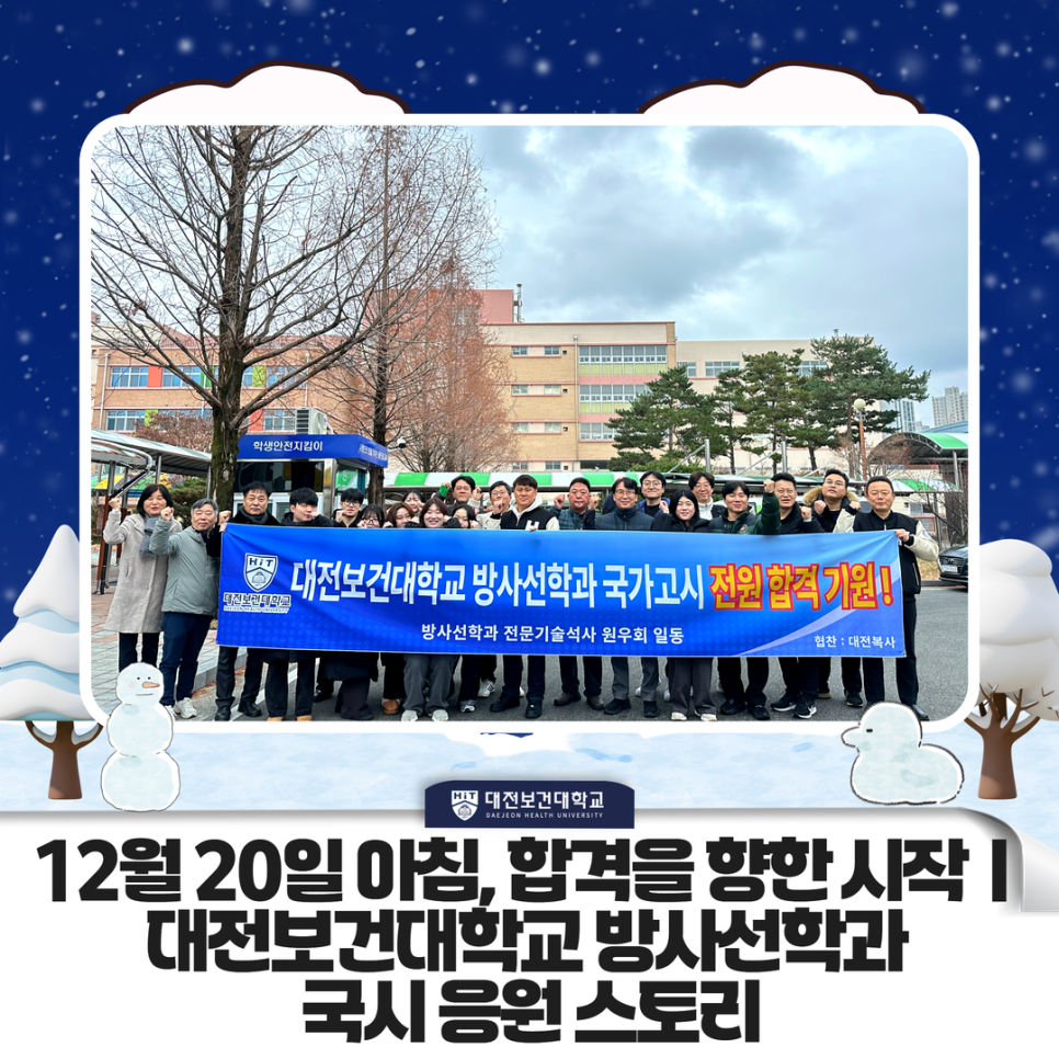 안녕하세요 여러분~ 대전보건대학교 블로그 지기입니다! 대전보건대학교 방사선학과가 지난 12월 20일 토요일 아침 7시, 제53회 방사선사 국가고시를 앞둔 수험생들을 위해 뜻깊은 합격 기원 응원 행사를 진행했습니다. 이른 아침임에도 불구하고 교수님들과 학과 학생들이 모두 함께 모여 따뜻한 격려의 시간을 가졌는데요. “잘 보고 와요”, “지금까지 해온 그대로면 충분해요” 라는 말 한마디, 따뜻한 눈빛 하나가 시험장으로 향하는 학생들의 긴장을 자연스럽게 풀어주었습니다. “어제 같은 100일 결단식, 벌써 국시의 날이라니!” 지난 9월 진행됐던 방사선사 국시 100일 결단식이 아직도 생생하죠. 그때만 해도 ‘아직 멀었다’고.......