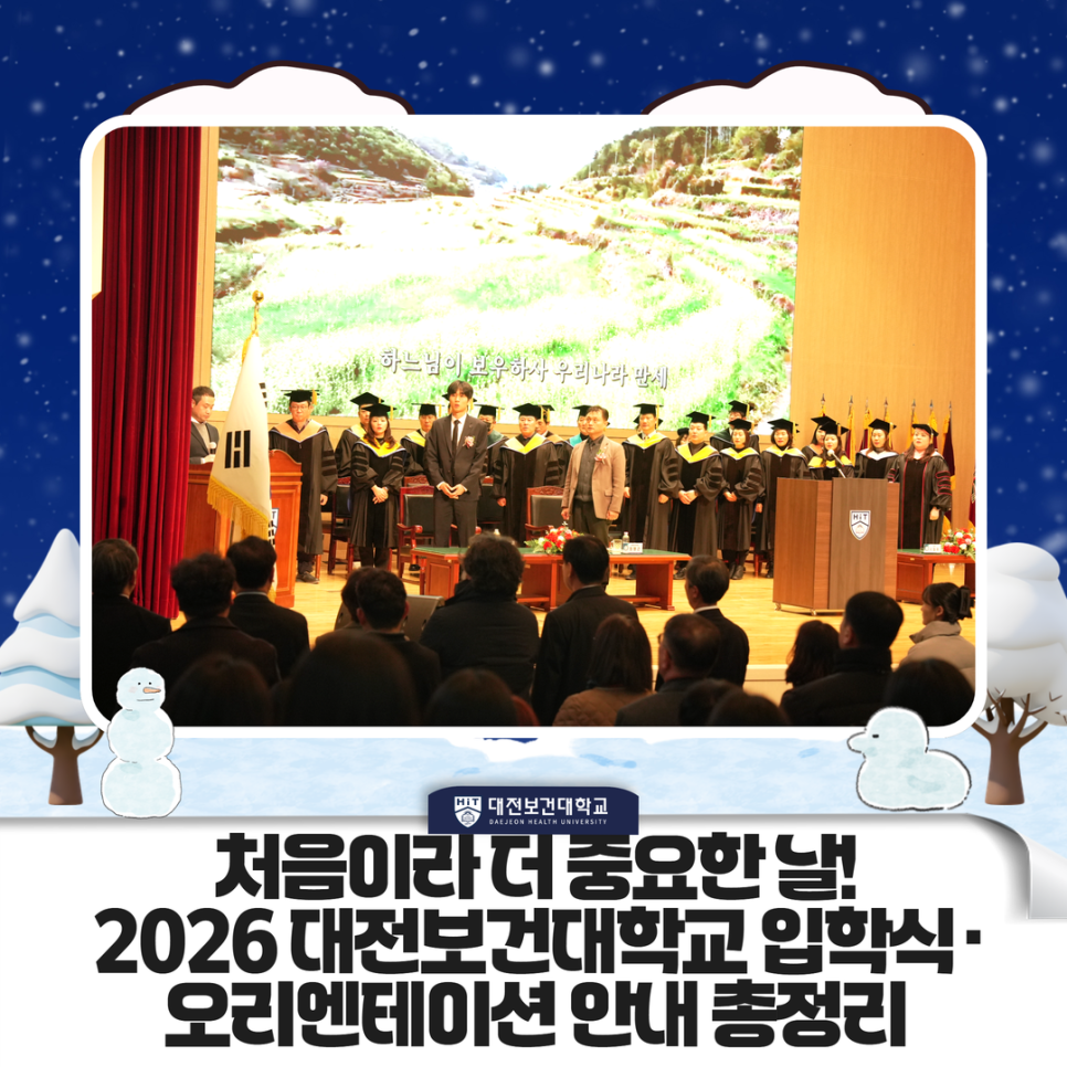 안녕하세요~ 대전보건대학교 공식 블로그입니다. 대전보건대학교(HIT) 예비 26학번 여러분! 여러분의 합격을 진심으로 축하드립니다! 드디어 기다리고 기다리던 캠퍼스 라이프의 첫 단추, 제49회 2026학년도 입학식 및 신입생 오리엔테이션(OT) 소식을 들고 왔습니다. "입학식은 어디서 하나요?", "우리 과 OT 장소는요?" 등등 궁금한 게 참 많으시죠? 여러분의 불안함을 확 날려줄 [대전보건대 입학식 A to Z]를 정리해 드릴 테니, 이 포스팅 하나만 정독하고 오세요! 1. 한눈에 보는 전체 일정 가장 중요한 건 뭐니 뭐니 해도 시간이죠! 늦지 않게 도착하는 센스! ✅일시: 2026년 2월 12일 (목요일) 오후 1:00부.......