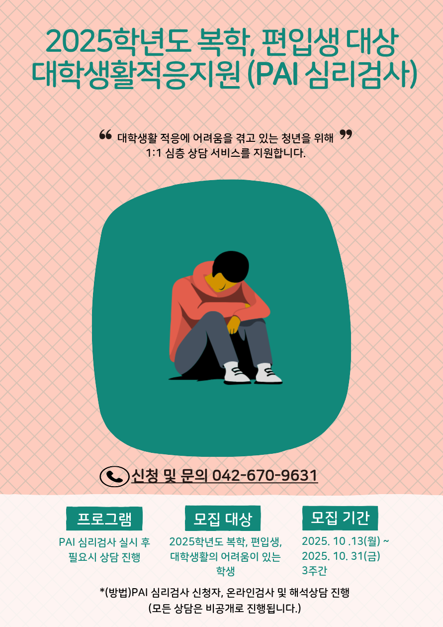 [학생상담실] 2025학년도 복학, 편입생 대상 대학생활적응지원 심리검사(PAI성격평가질문지) 실시 안내 | ||