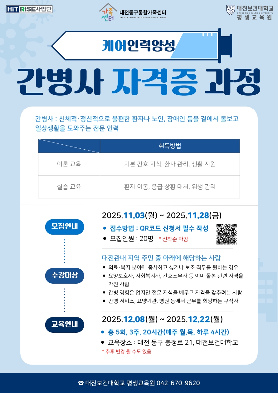 해당 자격과정 참여 관련하여 문의사항은 대전보건대학교 평생교육원 042-670-9622 로 연락주시기 바랍니다.