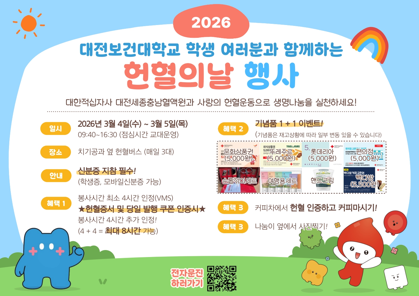 2026학년도 새학기를 시작하며 자원봉사센터에서는 대한적십자사와 연계하여 "생명나눔 사랑의 헌혈운동"을 아래와 같이 진행하오니 학생들의 많은 참여 부탁드립니다.