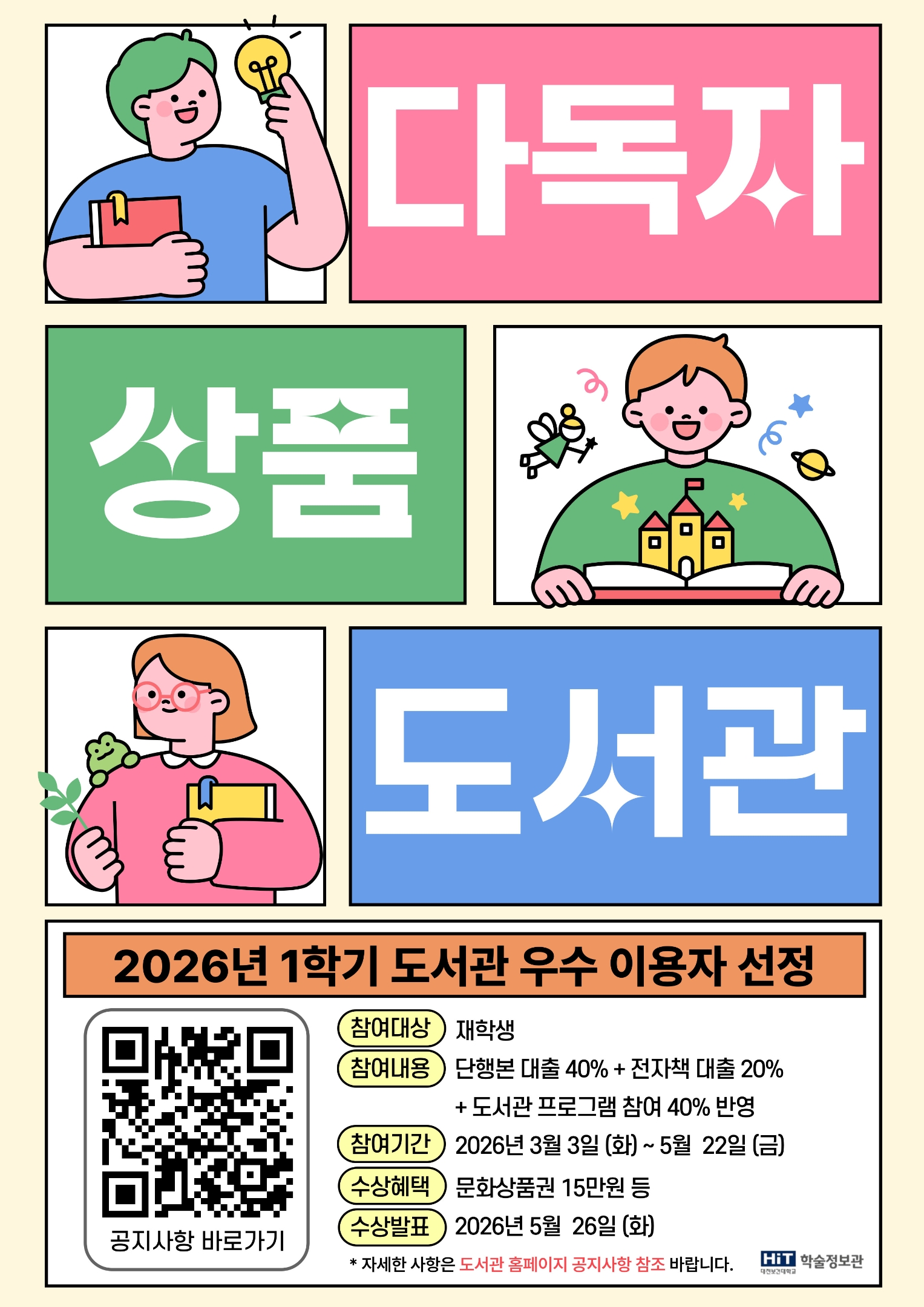 2026년 1학기 도서관 우수이용자를 아래와 같이 선정하오니 독서의 즐거움도 만끽하고! 상품도 받아가세요!