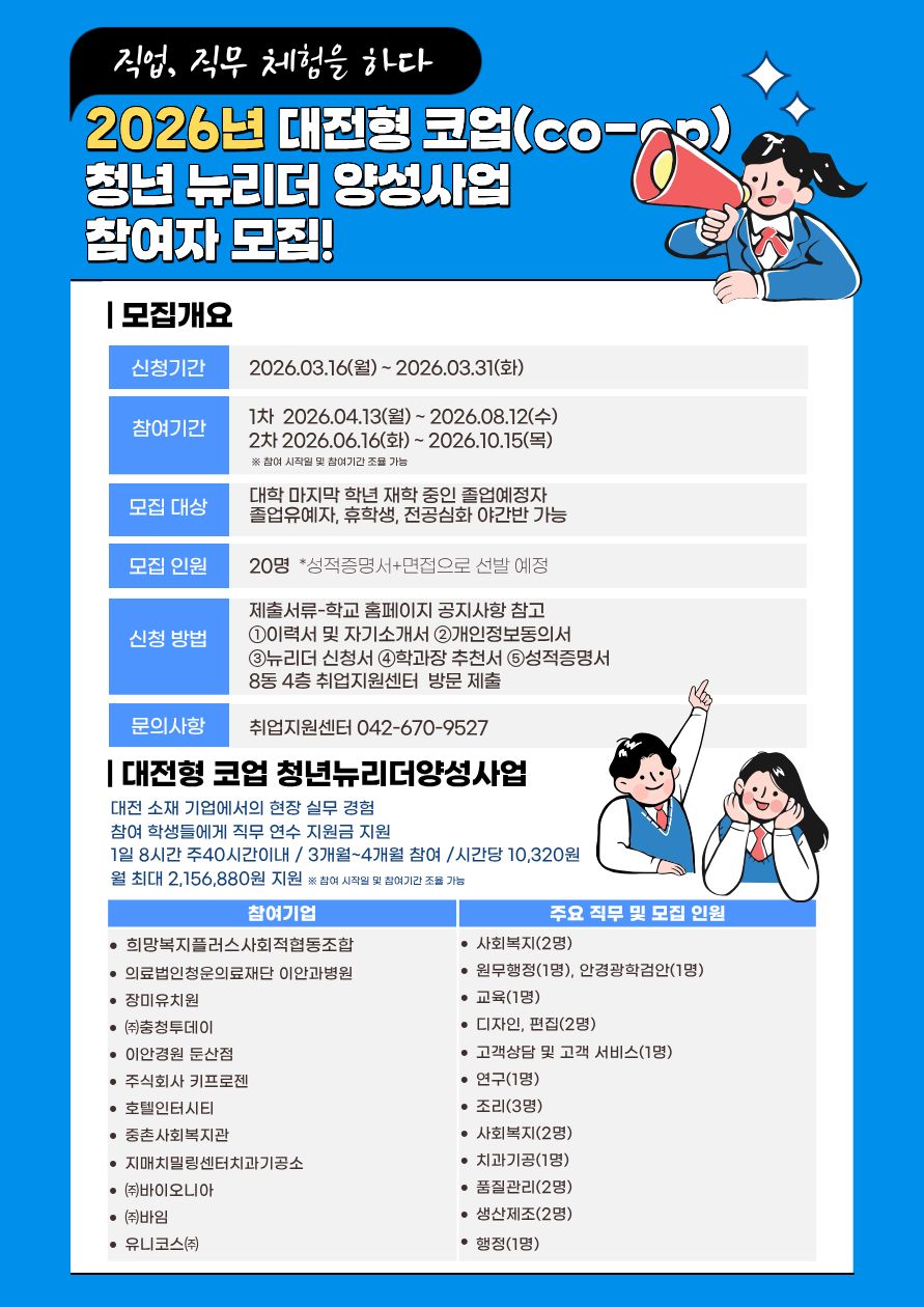| [취업지원센터] 2026년 대전형 코업 청년 뉴리더 양성사업 참여자 모집 안내 | ||